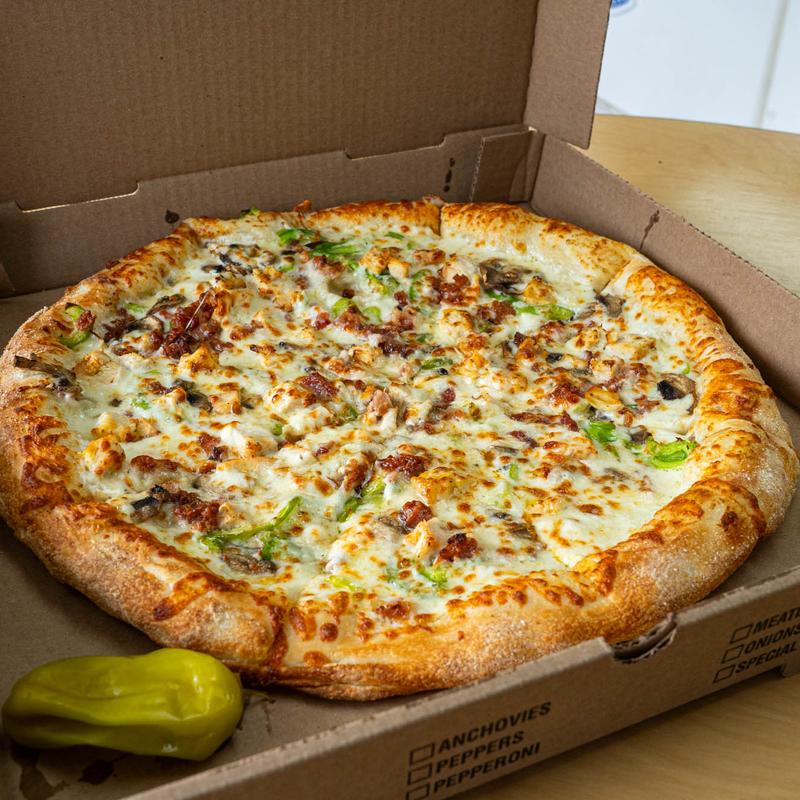 Ranch sauce, roasted chicken, mushrooms, green peppers, bacon, and mozzarella cheese.