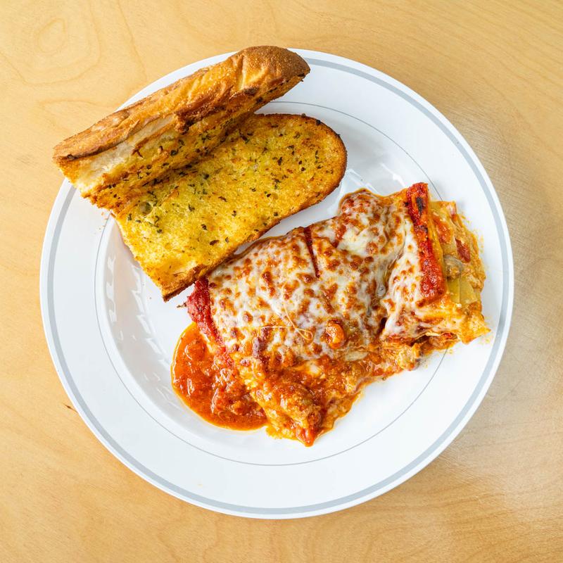 Loaded with ricotta, mozzarella, and parmesan cheese, marinara sauce, sausage, and beef. Served with salad and garlic bread.