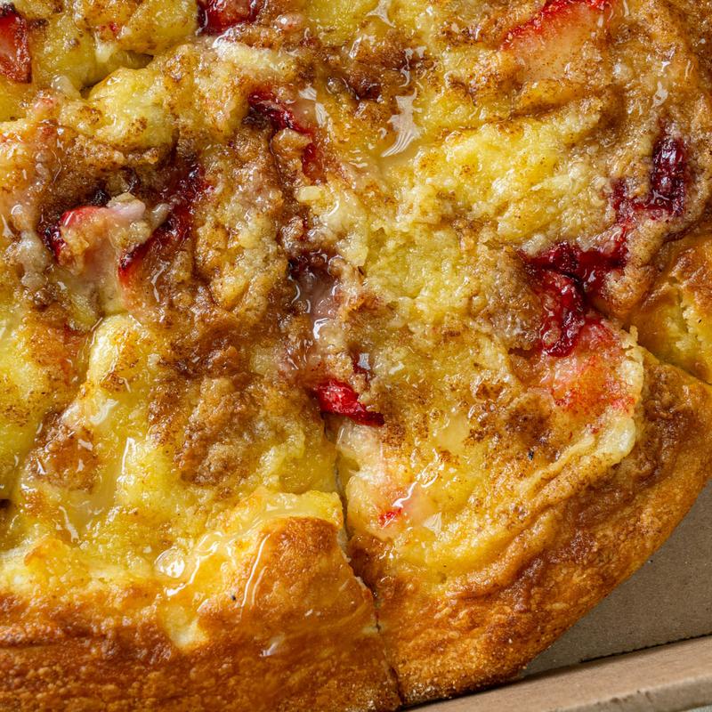 Red sauce base with roasted chicken, bacon, banana peppers, and mozzarella cheese. Topped with buffalo sauce and ranch drizzle, garlic butter crust, finished with fresh jalapeños.