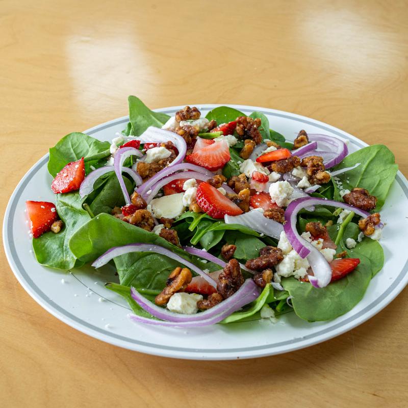 Baby spinach with fresh strawberries, red onions, candied walnuts, and feta cheese. Served with wine basil vinaigrette. Also available as a side salad.
