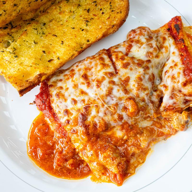 Fresh spaghetti noodles smothered in rich marinara sauce, topped with parmesan and mozzarella cheese, then baked to perfection. Served with garlic bread and salad.