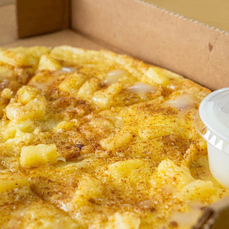 White sauce, a blend of ricotta cheese, garlic, and shredded parmesan cheese. Topped with extra cheese, with a choice of any two toppings.