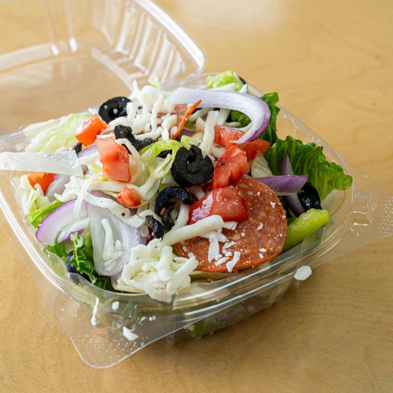 Iceberg and romaine blend, tomato, red onion, green pepper, black olives, pepperoni, pickle spear, and cheese.