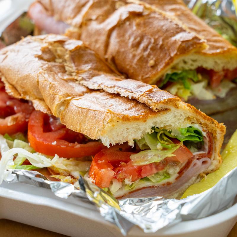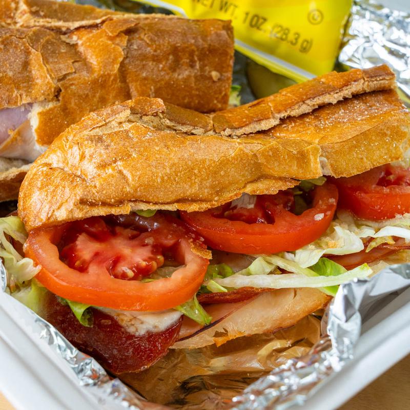Iceberg, romaine blend, tomato, red onions, green pepper, turkey, black olives, pickle spear, ham, cheese, pepperoni.
