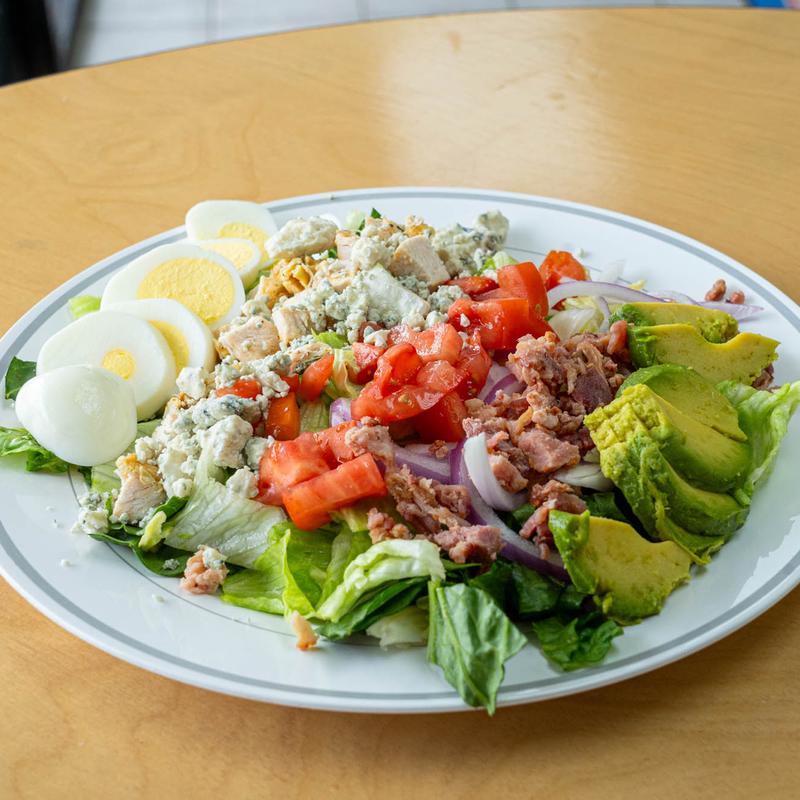 Iceberg, romaine blend, roasted chicken, bacon, tomatoes, red onions, avocado, egg, bleu cheese crumble.