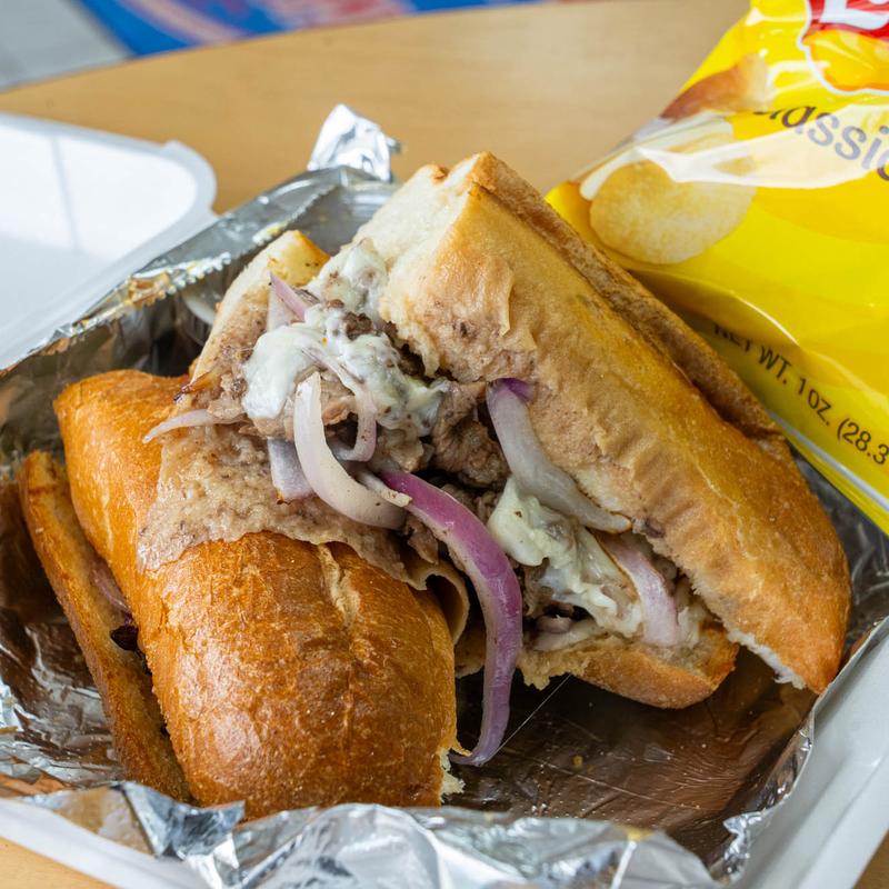 Philly steak, mushrooms, onions, green peppers, and mozzarella cheese.